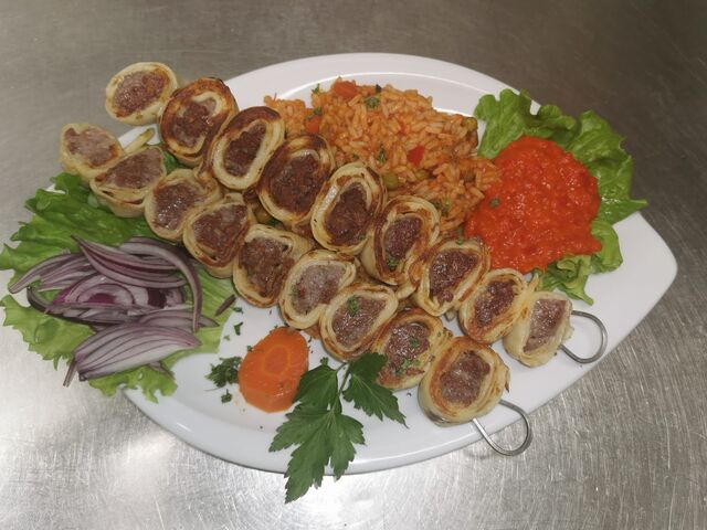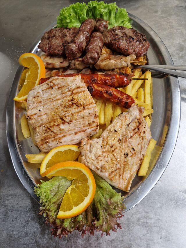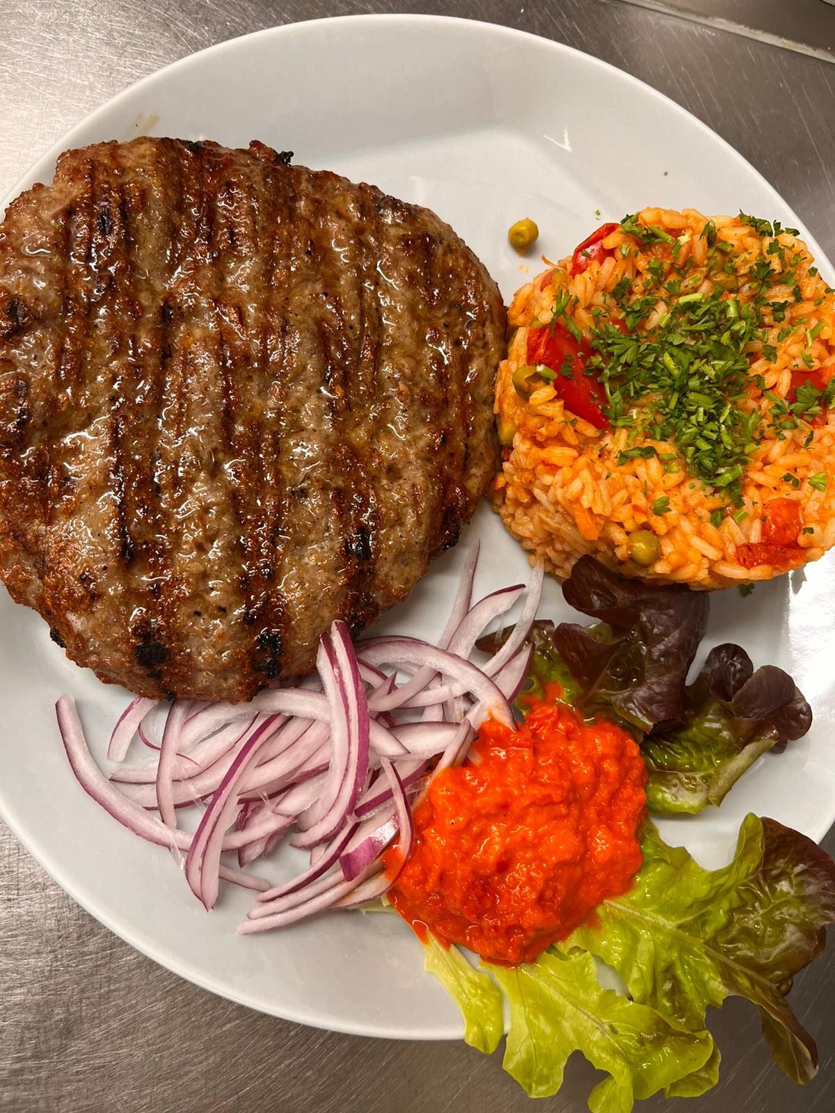 Grillplatte für zwei Personen. Saftige Cevapcici, Schweinefiletspieße, mit Schafkäse gefüllte Hacksteak, gegrillte Rinderleber, Ajvar, Zwiebel und als Beilage Djuvec reis und Pommes.
